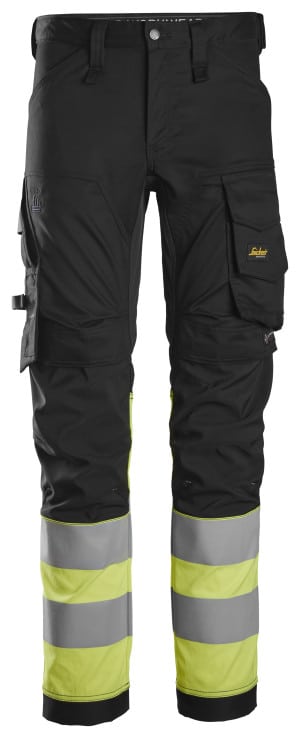 Komfortabel arbeidsbukse med høy synlighet i klasse 1 med smal passform for håndverkere som jobber i de generelle anleggssektorene, veiarbeid og transport.